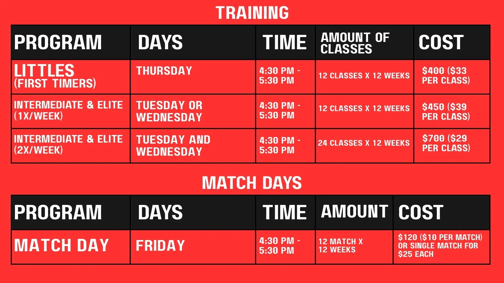 Our Spring 2026 classes start the week of March 9th and ends the week of May 25th. All Tuesday - Friday trainings will be at Harvard Park Field D at 4:30 PM.